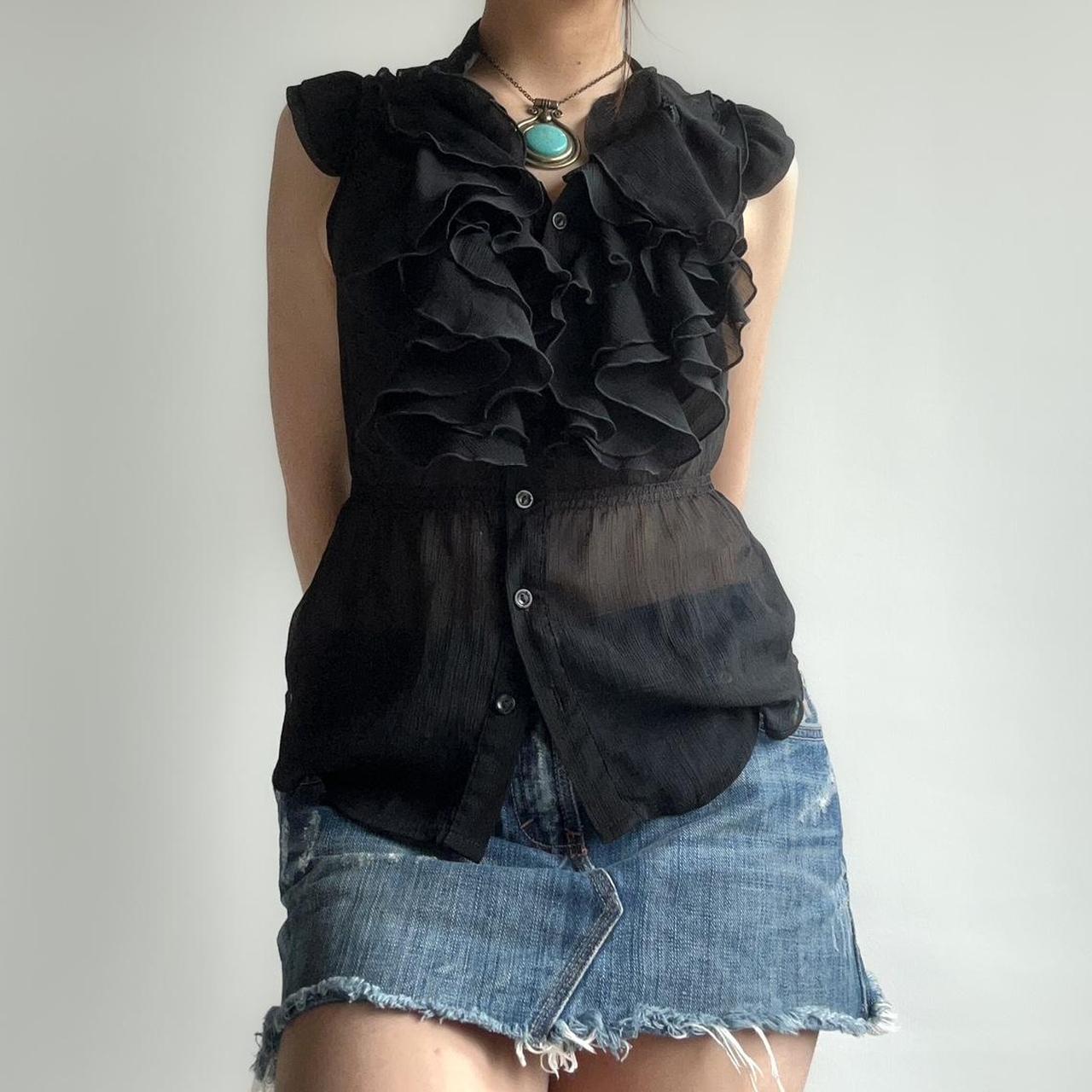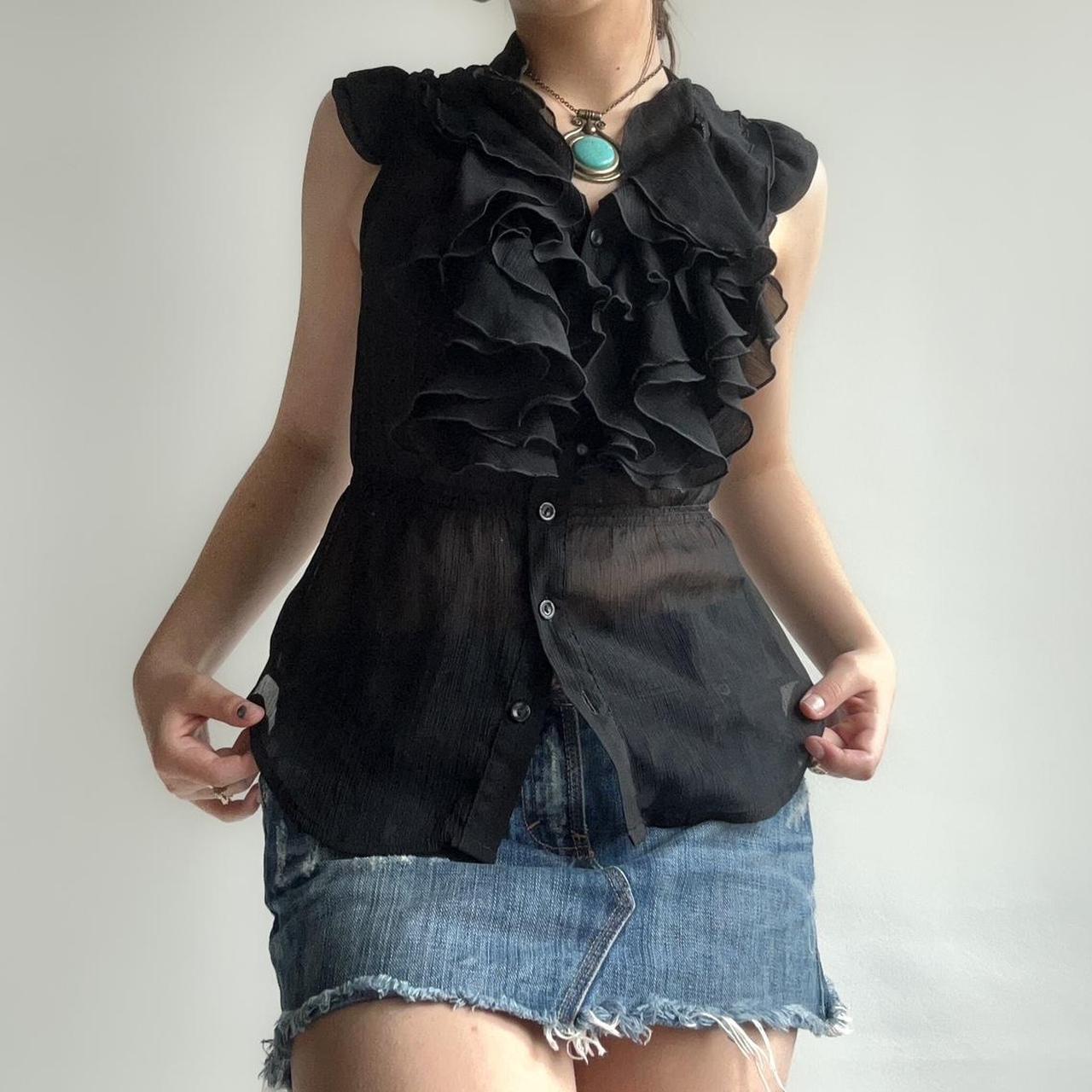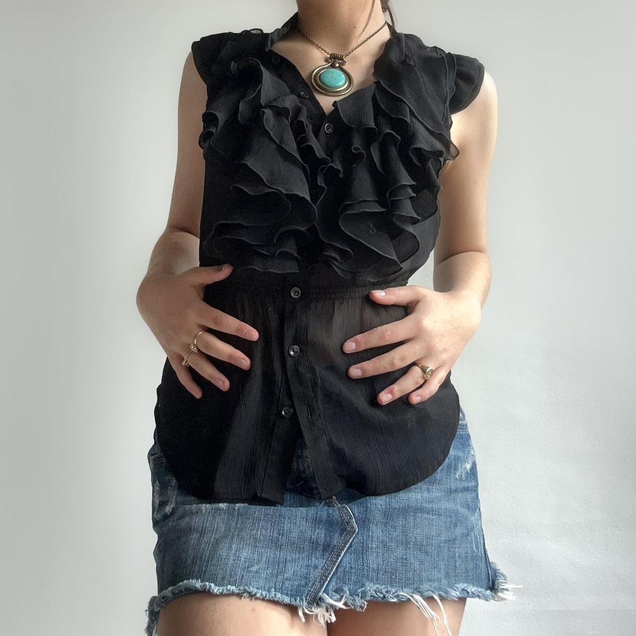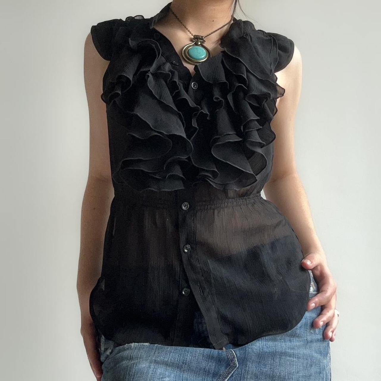 Elevate your wardrobe with this sophisticated sheer black blouse featuring delicate ruffled detailing. The lightweight, translucent fabric creates an elegant silhouette while the strategic ruffle placement adds dimension and visual interest. Perfect for layering over camisoles or bralettes for versatile styling options from office to evening occasions.