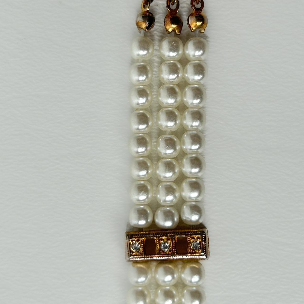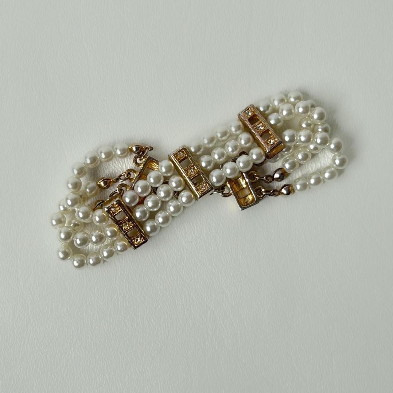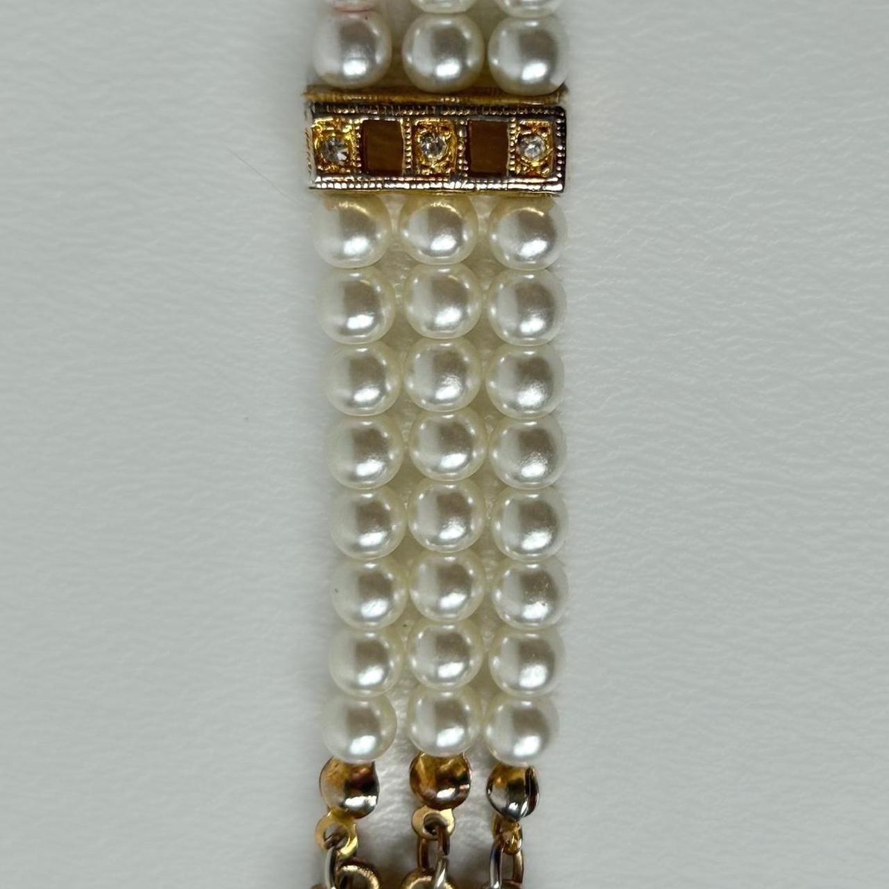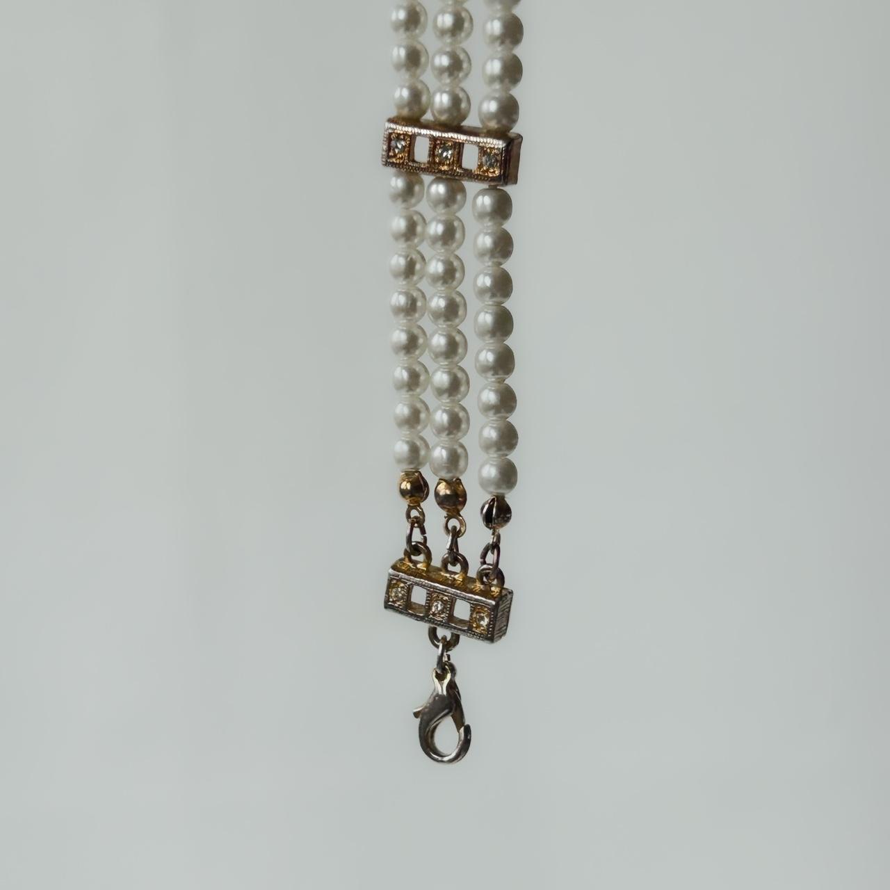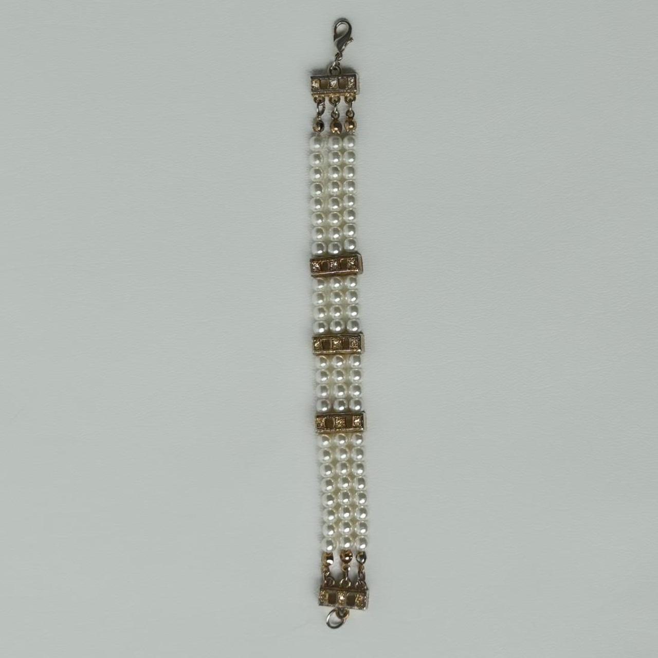 This meticulously crafted bracelet features high-quality faux pearls alternating with golden elements, enhanced by strategically placed rhinestones that capture and reflect light. The juxtaposition of the pearls' subtle iridescence against the warm golden tones creates a harmonious balance of classic and contemporary design elements. The secure clasp ensures comfortable wear while maintaining the bracelet's elegant silhouette on the wrist.