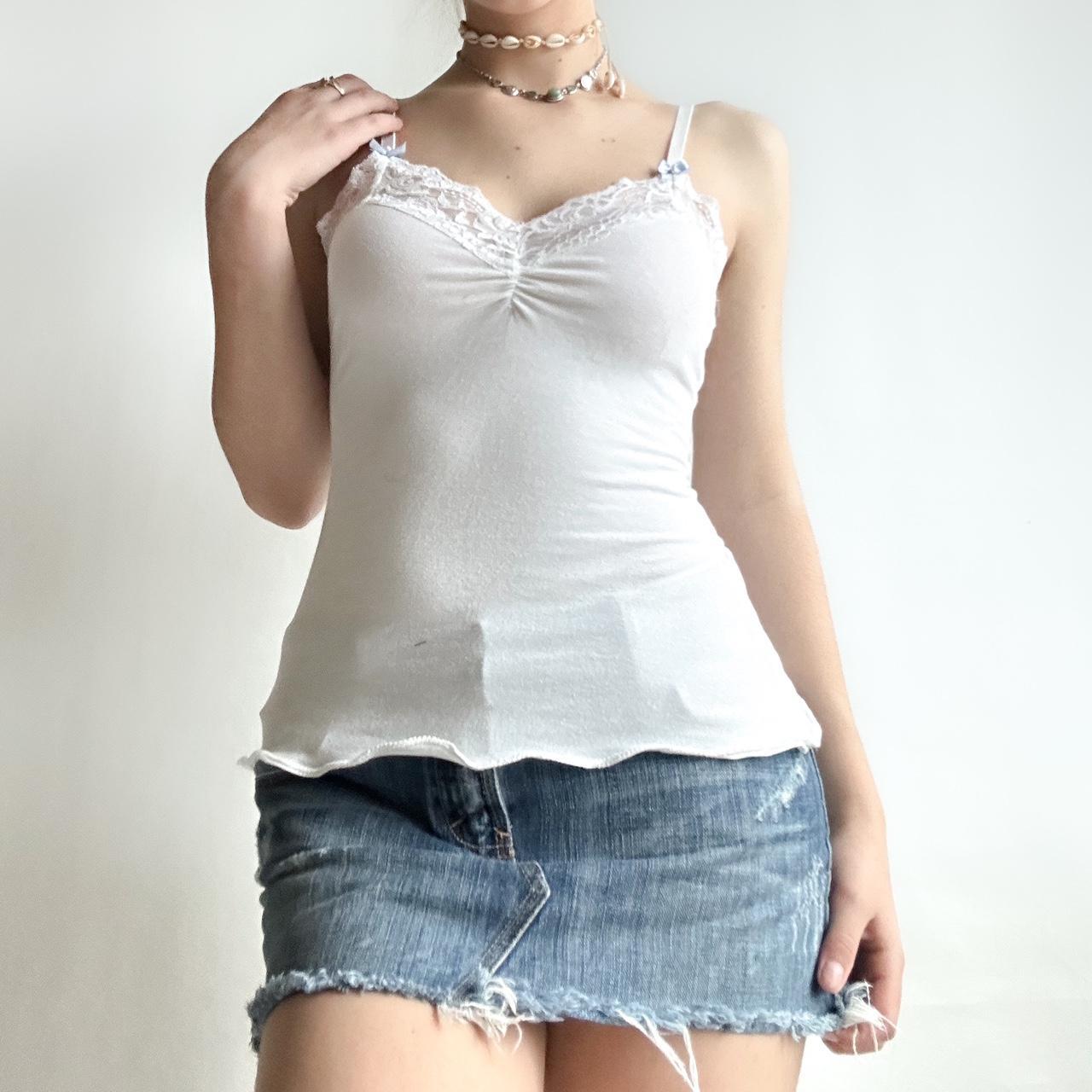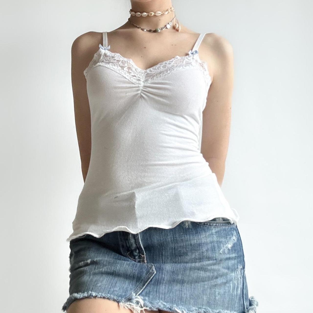 Elevate your wardrobe with this sophisticated white lace cami top. The expertly crafted ruched front detail creates a flattering silhouette, while delicate baby blue bows adorn each strap for a subtle touch of femininity. Perfect for layering or wearing alone, this versatile piece transitions effortlessly from day to evening wear.